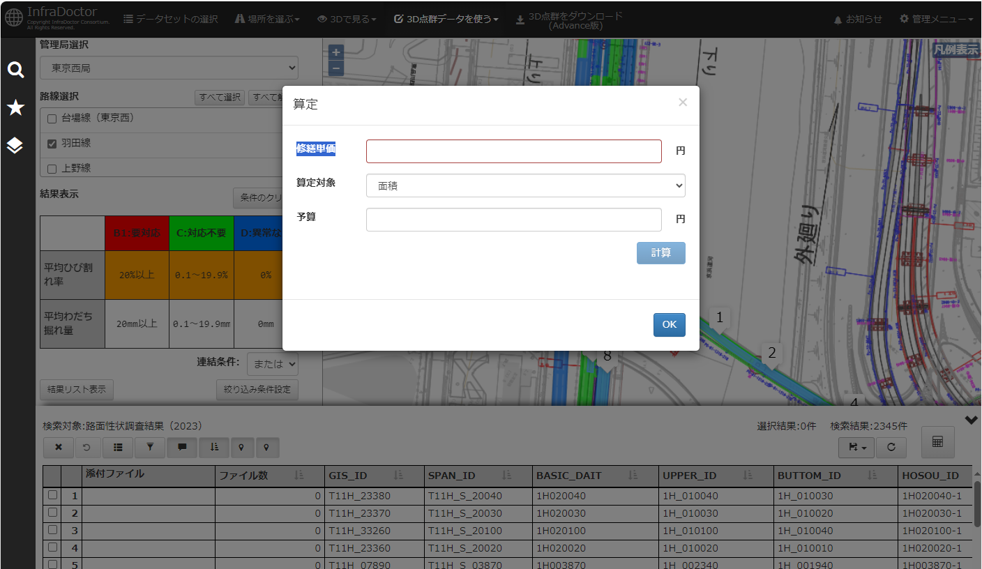 インフラドクター®WEBには舗装補修費用の算出機能が搭載されています。